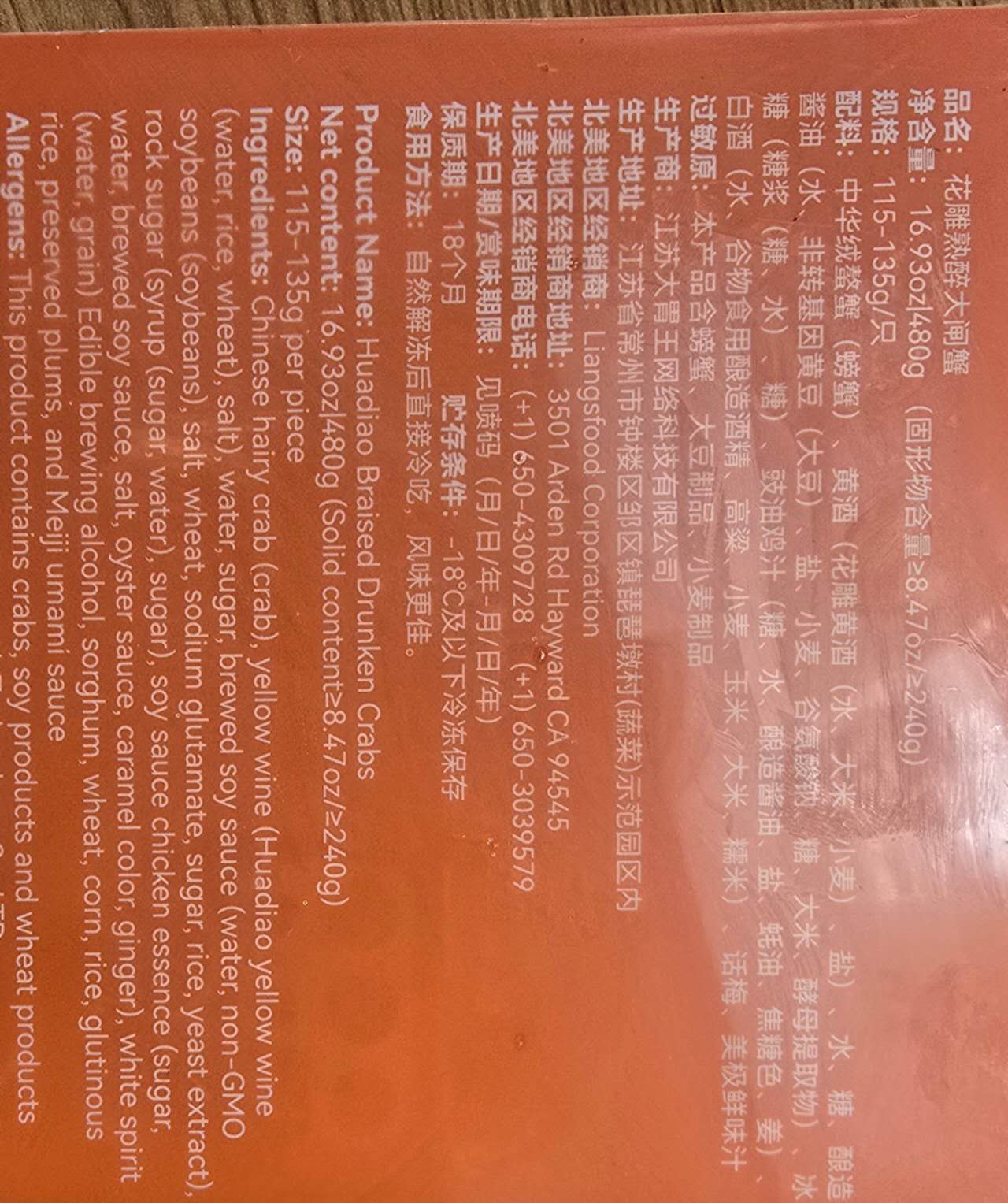 食用方法:将冷冻保存的醉蟹拿出放常温下至完全解冻至室温即可打开食用,剩余的醉料不要浪费,将油煎过的素鸡放按水1醉料1的比例的醉料汁,中火煮5分钟即是一道美味的酒醉素鸡,也可以用醉料汁做红烧小排,这样做出来的小排酒香浓郁,甜鲜味美,是一道与众不同的江南红烧排骨
